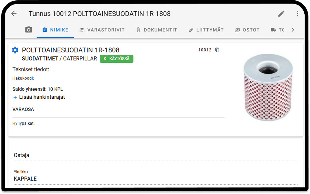 Järjestelmästä näkee suoraan nimikkeiden varastosaldon, ja uusia ostotilauksia voi tehdä ennen kuin varaosat pääsevät loppumaan.